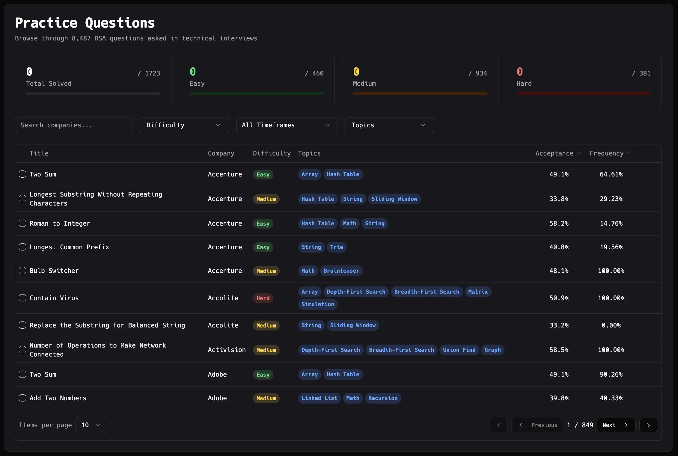 Filter by company, topic, and difficulty. Practice smarter for your next tech interview.