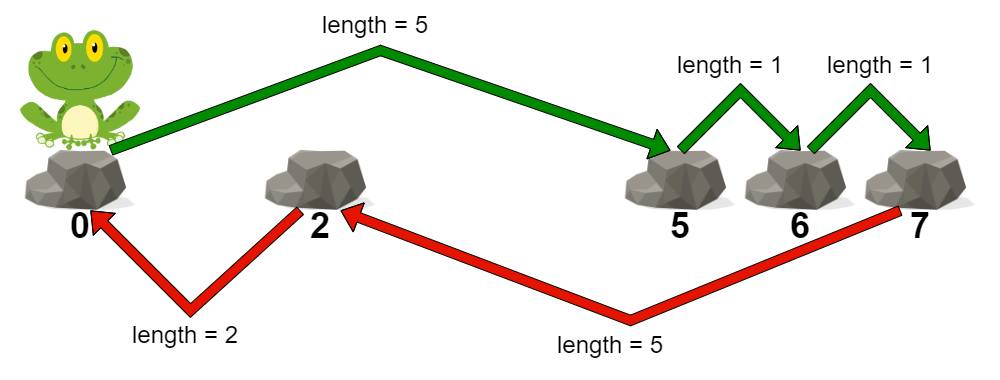 Input: stones = [0,2,5,6,7] Output: 5 Explanation: The above figure represents one of the optimal paths the frog can take. The cost of this path is 5, which is the maximum length of a jump. Since it is not possible to achieve a cost of less than 5, we return it.